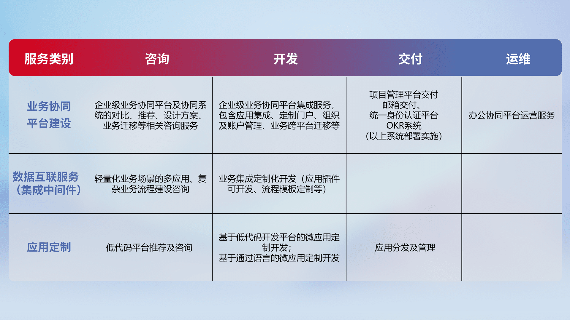 针对钉钉、、企微、、、IDaas等平台级产品提供产品的规划、、方案、、交付、、、、定制化开发等服务,,实现如统一协同办公、、、、智能客户服务、、、、混合会议管理、、智能数据查询、、、等业务场景,,实现数字化转型。。。